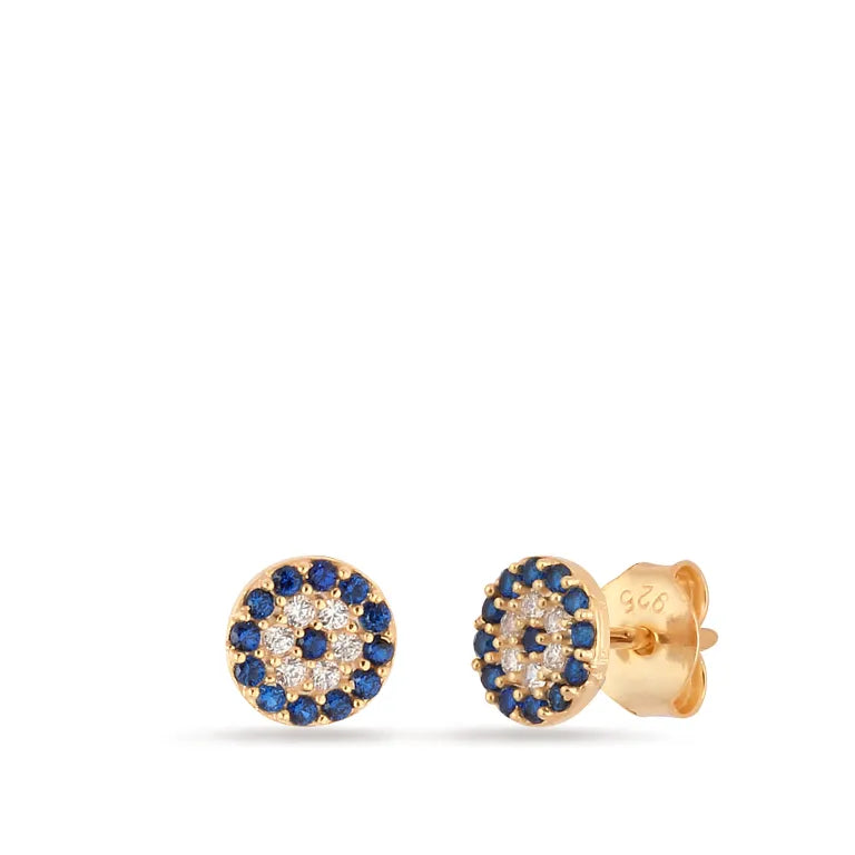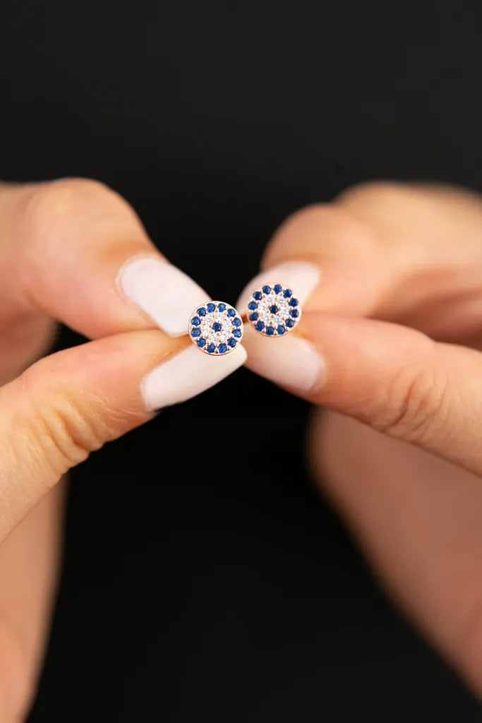 Filigrane Ohrringe aus Sterling Silber mit blau und weiß farbenen Zirkonia Steinchen im Nazar Look.