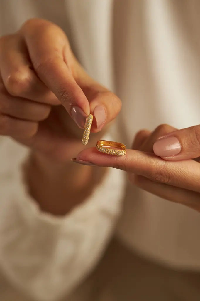 Die Materialien der Sparkle Hoops Ohrringe bestehen aus hochwertigem 925 Sterling Silber und sind in zwei Varianten erhältlich: Silber oder mit einer 14K-Vergoldung. Diese hochwertigen Materialien gewährleisten nicht nur Langlebigkeit, sondern auch eine zeitlose Ästhetik, die über Jahre hinweg ihre Brillanz bewahrt.