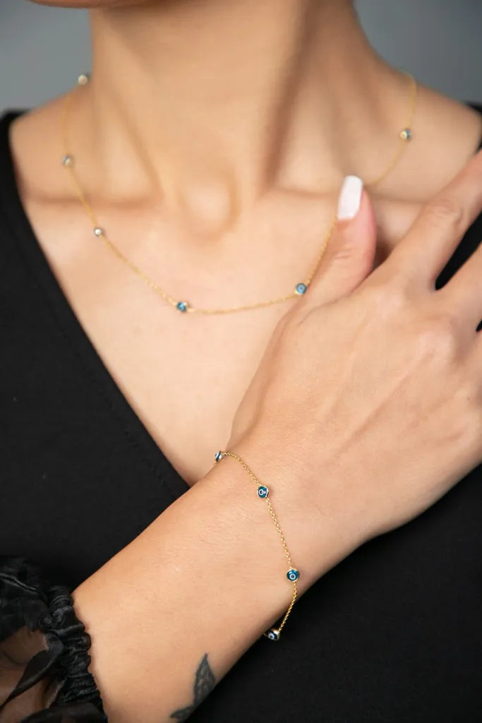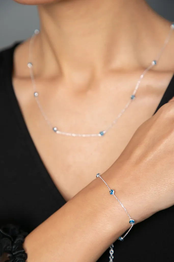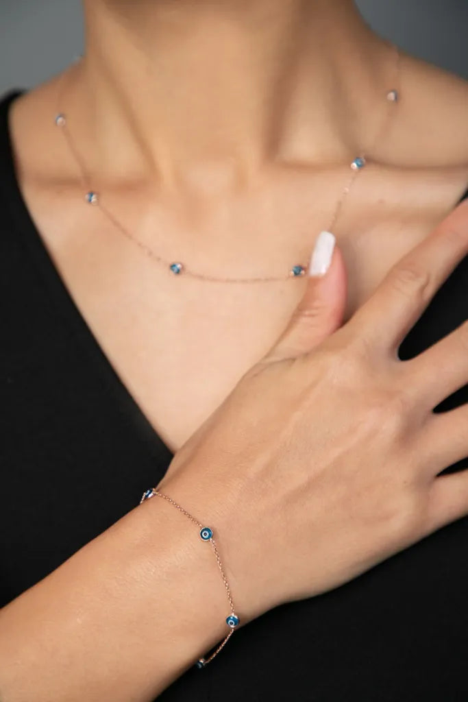 Hochwertiges Set aus Halskette und Armband aus (vergoldetem / rosé vergoldetem) 925 Sterling Silber. Veredelt mit blau farbenen, klar glänzenden Zirkonia Kristallen.