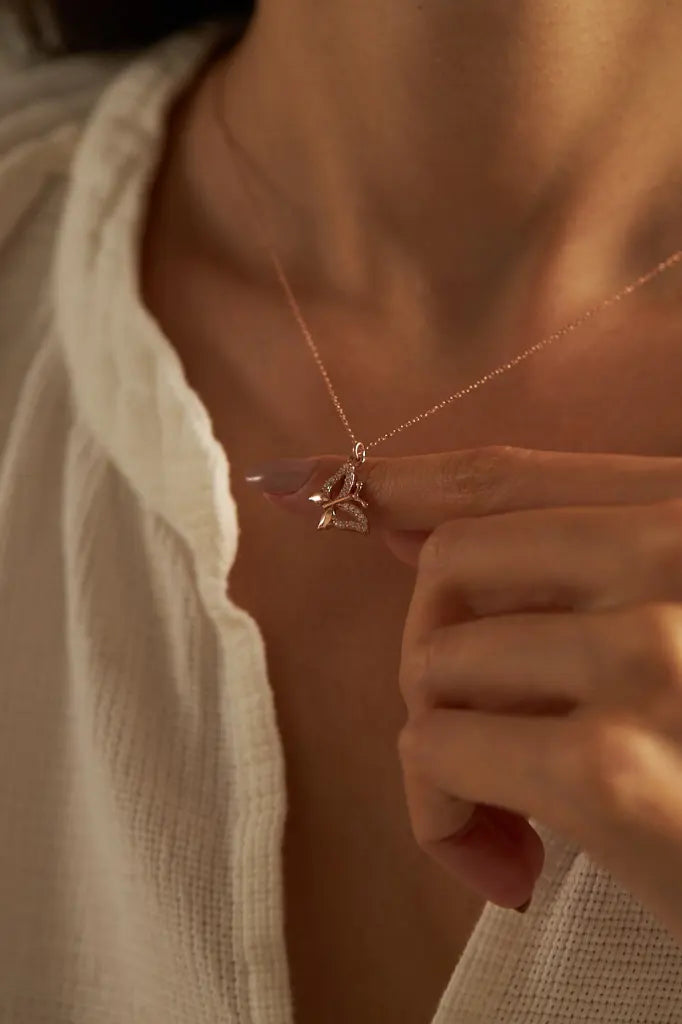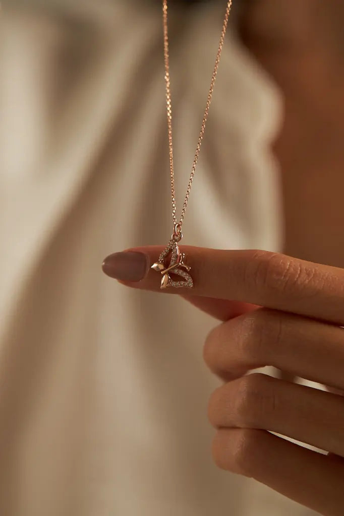 Hergestellt aus hochwertigem Edelstahl und kunstvoll mit 14K Roségold vergoldet, präsentiert sich diese Halskette als langlebiges und ansprechendes Schmuckstück. Der Schmetterlingsanhänger, ein Symbol der Verwandlung und Erneuerung, verleiht der Kette eine zusätzliche symbolische Bedeutung.